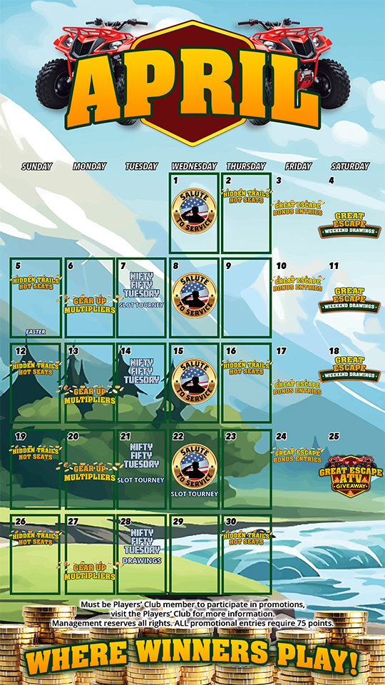NIFTY FIFTY TUESDAYS Up to $35 Bonus Slot Play! The more you play, the more we pay! MUST BE 50 YEARS OR BETTER FOR ALL NIFTY FIFTY PROMOS. SALUTE TO SERVICE WEDNESDAYS Swipe at Kiosk for rewards every Wednesday. Military and Veterans ONLY. Proof of service required for ALL Salute to Service promos.